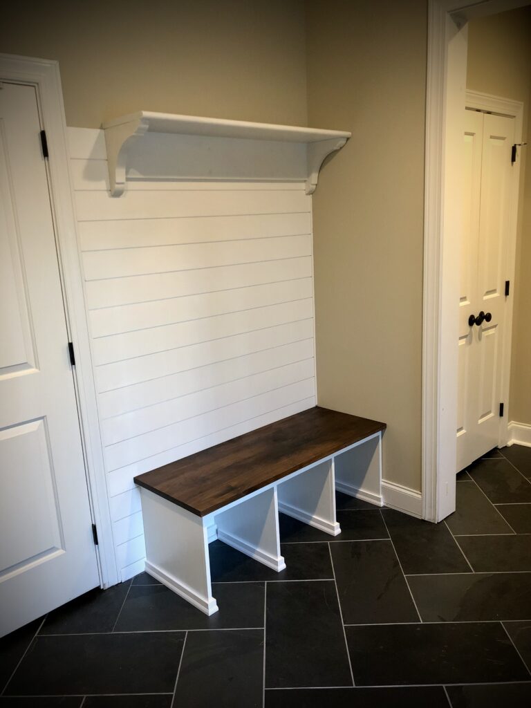 - Project: Mudroom bench with shoe cubbies, coat hooks, storage shelf