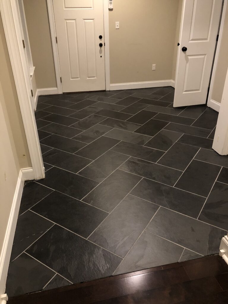 - Interesting Project Note: I installed the herringbone pattern slate tile floor as part of this project. Never again. An existing ceramic tile floor needed removed first, concrete slab needed grinding, filling, and leveling after. 12″ x 24″ slate tiles were then installed in the aforementioned pattern. My knees still hurt from this project. Ever used a wet saw outside in the dead of winter? Yeah. Not a pleasant experience. But I guess it turned out okay in the end.
